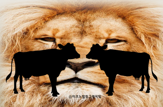 죄수의 딜레마 게임을 두 마리 황소와 사자 우화에 연결해 볼까요? 황소 둘에게 협력(함께 다니기)이 사자의 공격을 방어할 수 있지만 배신(따로 다니기)가 사자에게 차례로 잡아먹힐 수 있습니다. 사자는 검사처럼 배신을 유도하는 역할입니다. 그러나 황소 개별적으로는 따로 행동이 서로 간섭받지 않고 먹이 활동이 가능하기 때문이 유혹적입니다. 하지만 이는 둘 모두 사자의 먹이가 되는 결과를 낳습니다. 황소들은 서로 협력하지 않음으로써 죄수의 딜레마에서 자백을 택한 죄수들처럼 배신을 합리적 선택인 양 받아들인 셈이 됐습니다.