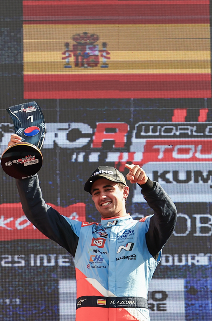 미켈 아즈코나 선수가 10월 17일(금)~19일(일) 열린 '2025 TCR 월드투어' 6라운드 한국 대회에서 우승을 차지하고 기뻐하는 모습. 사진=현대차·기아커뮤니케이션센터.