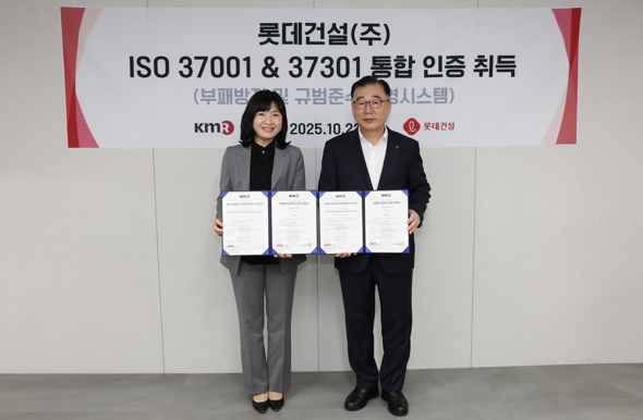 롯데건설이 부패방지 경영시스템(ISO 37001)과 규범준수 경영시스템(ISO 37301) 인증을 한꺼번에 취득했다. 이로써 글로벌 수준의 준법경영 체계를 구축하게 됐다.