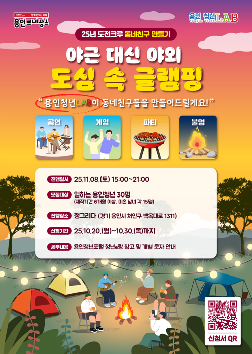 용인특례시(시장 이상일)가 11월 6일 오후 7시 기흥구 상하동 소재 '우리동네 청년공간' 카페에서 '가을밤의 작은 콘서트'를, 또 11월 8일에는 처인구 소재 글램핑장에서 '도심 속 글램핑'을 각각 개최한다.