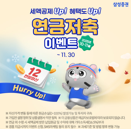 삼성증권이 '세액공제 Up 혜택도 Up Hurry Up! 연금저축 이벤트'를 11월 30일(일)까지 진행한다고 밝혔다. 자료=삼성증권.