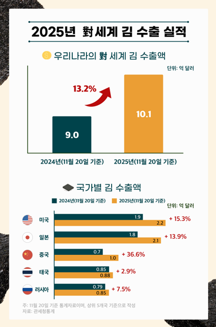 올해 김 수출액은 지난 20일 기준 10억1,500만 달러(약 1조5,000억 원)를 기록하며 지난해 같은 시기 대비 13.2% 증가했다.