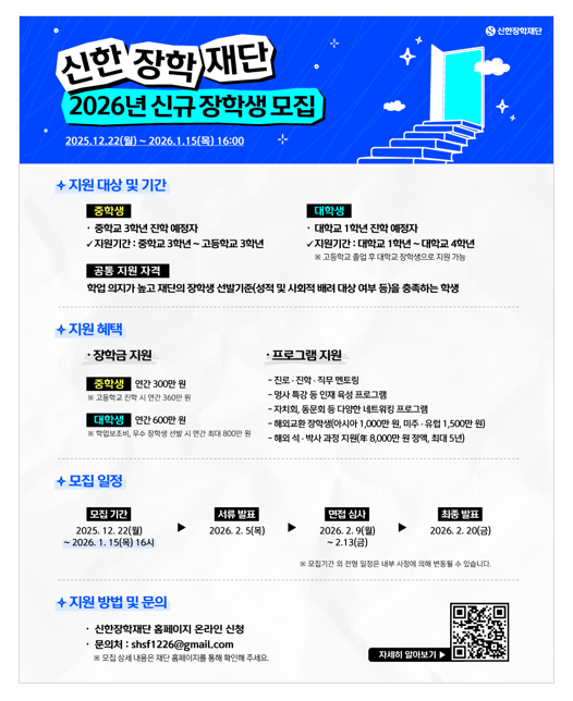 신한장학재단(이사장 진옥동)은 2026학년도 중학교 3학년 진학 예정자 및 대학 입학 예정자를 대상으로 신규 장학생을 모집한다고 22일 밝혔다. 자료=신한장학재단.