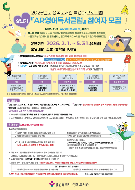 용인특례시 성복도서관이 16일부터 2026년 'AR(Accelerated Reader)영어독서클럽' 상반기 참여자 100명을 모집한다.