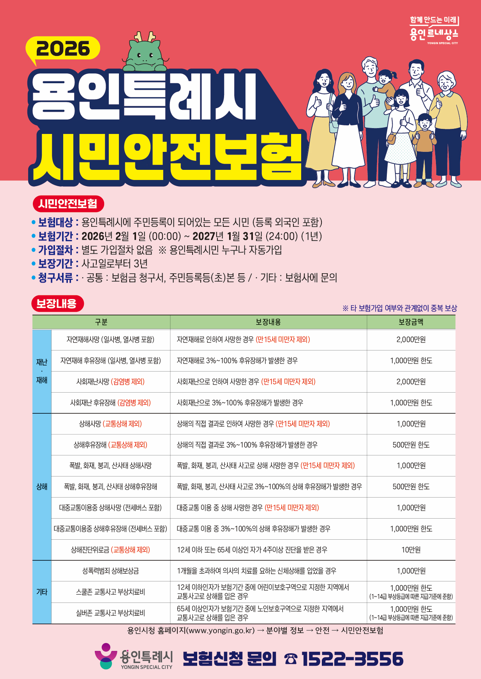 보험 기간은 2026년 2월~2027년 1월이며 매년 1년 단위로 계약을 갱신할 예정이라고 용인특례시측은 2일 밝혔다.