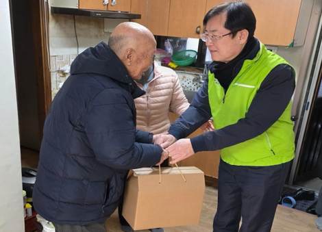 안병우 축산경제대표이사(오른쪽)가 2일 흑석종합사회복지관에서 독거노인에게 우리 축산물 꾸러미를 전달하고 있다. 사진=농협.
