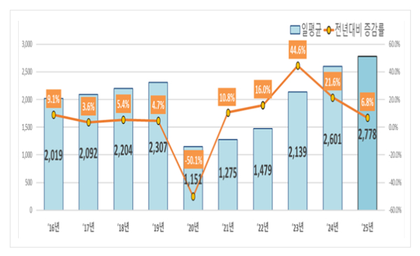 특히 영공을 지나는 국제 통과 비행은 전년 대비 21.0% 증가하며 우리나라가 동북아 핵심 항공 허브 역할을 하는 것으로 평가됐다. 영공을 지나는 국제 통과 비행 증가 추이는 2021년 일556대→2022년 일757대 →2023년 일1,495대 →2024년 일1,974대 →2025년 일2,160대로 나타났다.
