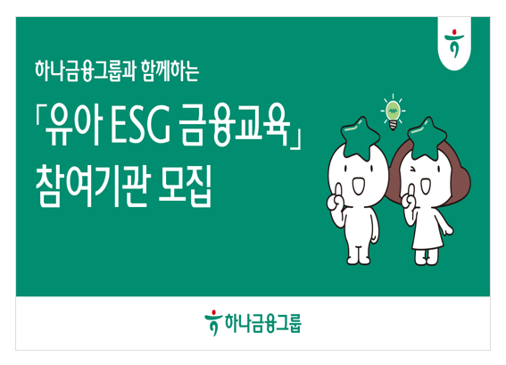 하나금융그룹(회장 함영주)은 '하나금융그룹 100호 어린이집'을 대상으로 소프트웨어(SW) 및 금융 교육을 제공하는 『유아 ESG 금융 교육』 참여 기관을 모집한다. 오는 3월 13일까지다.